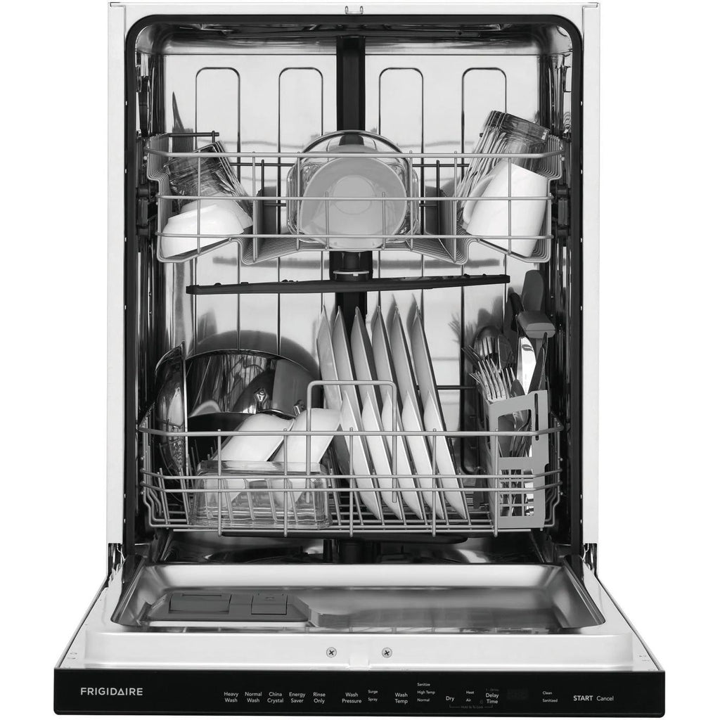 Self-cleaning filter eliminates food particles, keeping dishes clean.