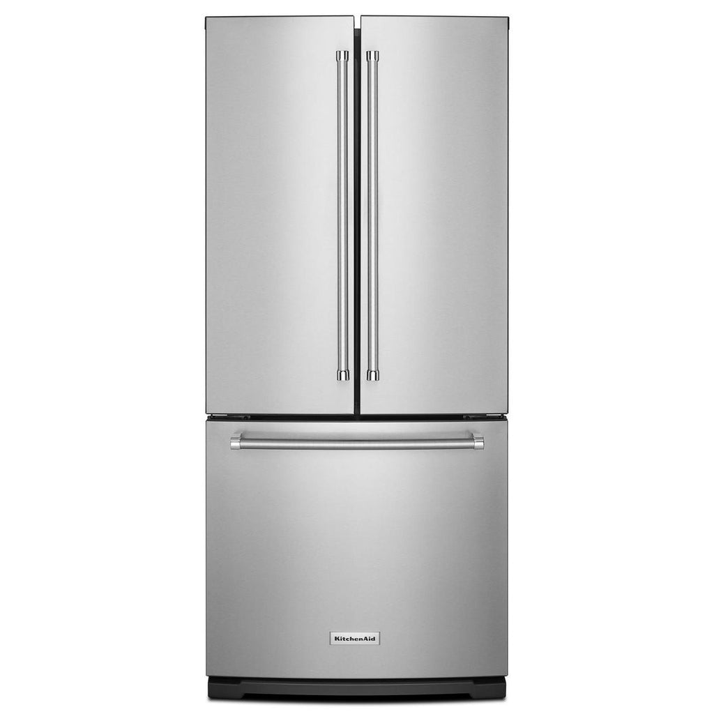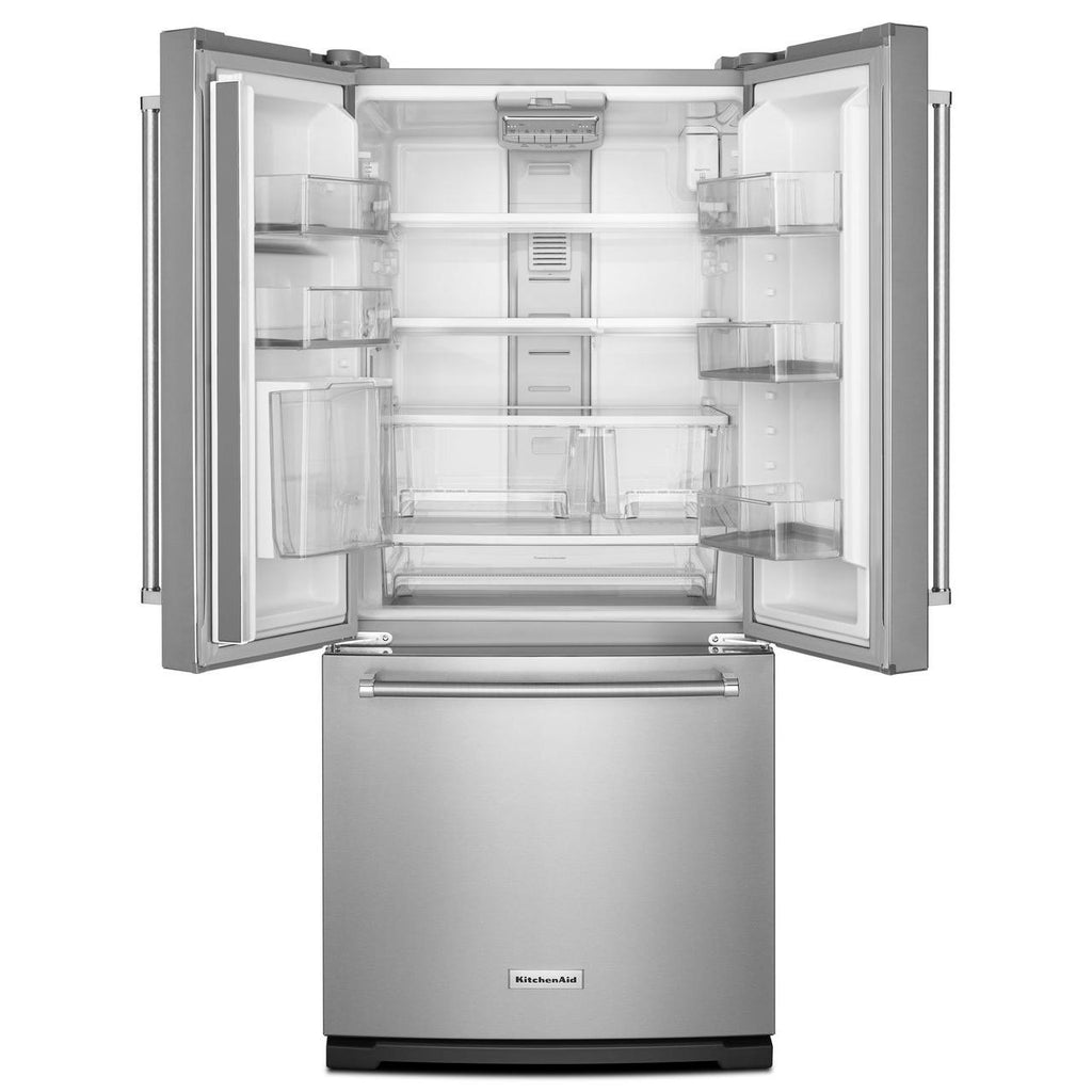 A bold blend of professionally-inspired styling and sleek touches for the home. This striking French Door Bottom Mount refrigerator features Satin Textured Handles with iconic KitchenAid Brand Medallions and the KitchenAid® Badge, a symbol of uncompromised quality.
