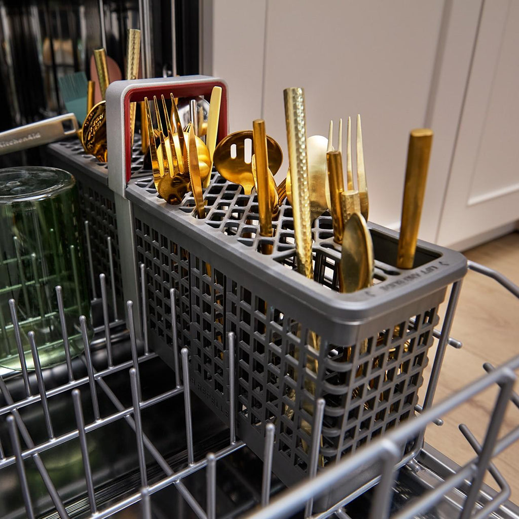 Is the only third rack with 360° wash jets to clean pint glasses, coffee mugs and cereal bowls inside and out. The largest third rack available,* it also has a removable utensil caddy for cooking tools and features moisture-wicking tines for table-ready dishes.
