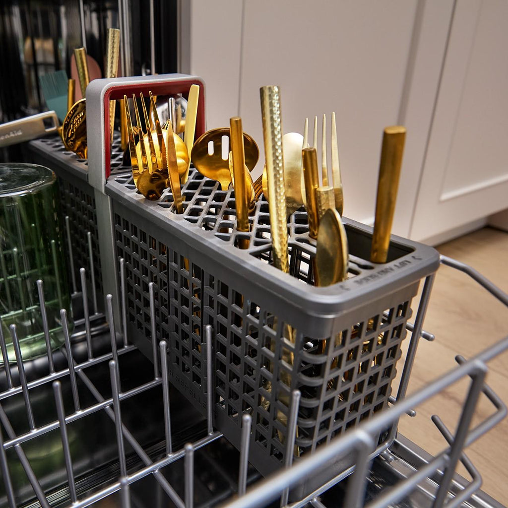Is the only third rack with 360° wash jets to clean pint glasses, coffee mugs and cereal bowls inside and out. The largest third rack available,* it also has a removable utensil caddy for cooking tools and features moisture-wicking tines for table-ready dishes.